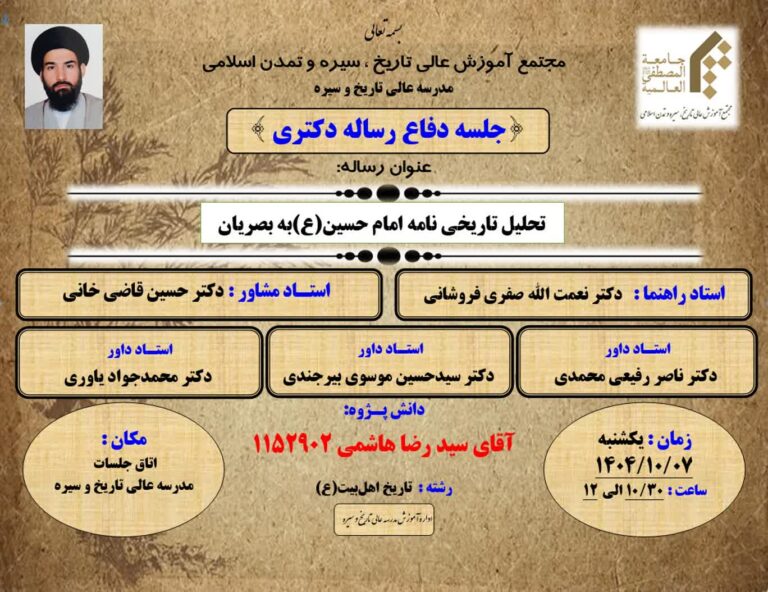 جلسه دفاع رساله دکتری دانش پژوه سید رضا هاشمی با عنوان «تحلیل تاریخی نامه امام حسین (علیه السلام) به بصریان» با راهنمایی دکتر