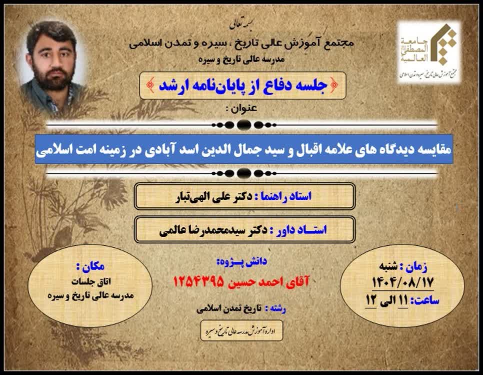 جلسه دفاع از پایان نامه ارشد دانش پژوه احمد حسین با عنوان «مقایسه دیدگاه های علامه اقبال و سید جمال الدین اسد آبادی در زمینه امت اسلامی» با راهنمایی دکتر علی الهی تبار و داوری دکتر سید محمذ رضا عالمی 18 آبان 1404 در اتاق جلسات مجتمع عالی تاریخ و سیره برگزار می گردد.