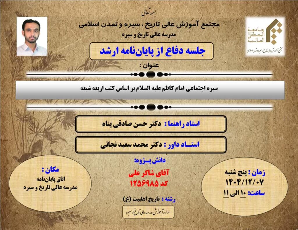 جلسه دفاع از پایان نامه دانش پژوه شاکر علی با عنوان «سیره اجتماعی امام کاظم (علیه السلام) بر اساس کتب اربعه شیعه» با راهنمایی دکتر حسن صادقی پناه و داوری دکتر محمد سعید نجاتی 7 اسفند 1404 در اتاق پایان نامه مدرسه عالی تاریخ و سیره برگزار می گردد.