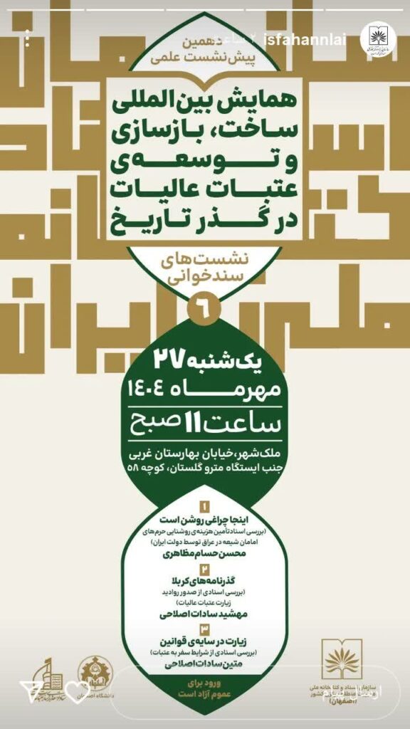 دهمین پیش نشست علمی همایش بین المللی ساخت، بازسازی و توسعه ی عتبات عالیات در گذر تاریخ» 27 مهر 1404 در ملک شهر برگزار می گردد.