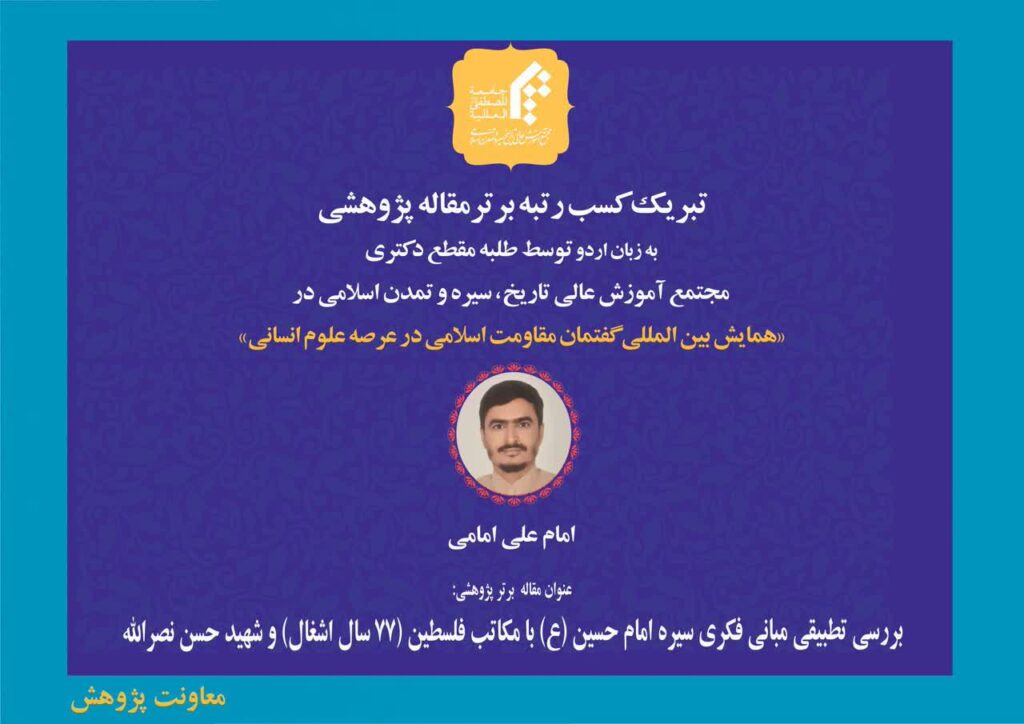 کسب رتبه برتر مقاله پژوهشی «به زبان اردو» توسط طلبه مقطع دکتری مجتمع آموزش عالی تاریخ، سیره و تمدن اسلامی جناب آقای امام علی امامی در «همایش بین المللی گفتمان مقاومت اسلامی در عرصه علوم انسانی» را تبریک می گوییم.