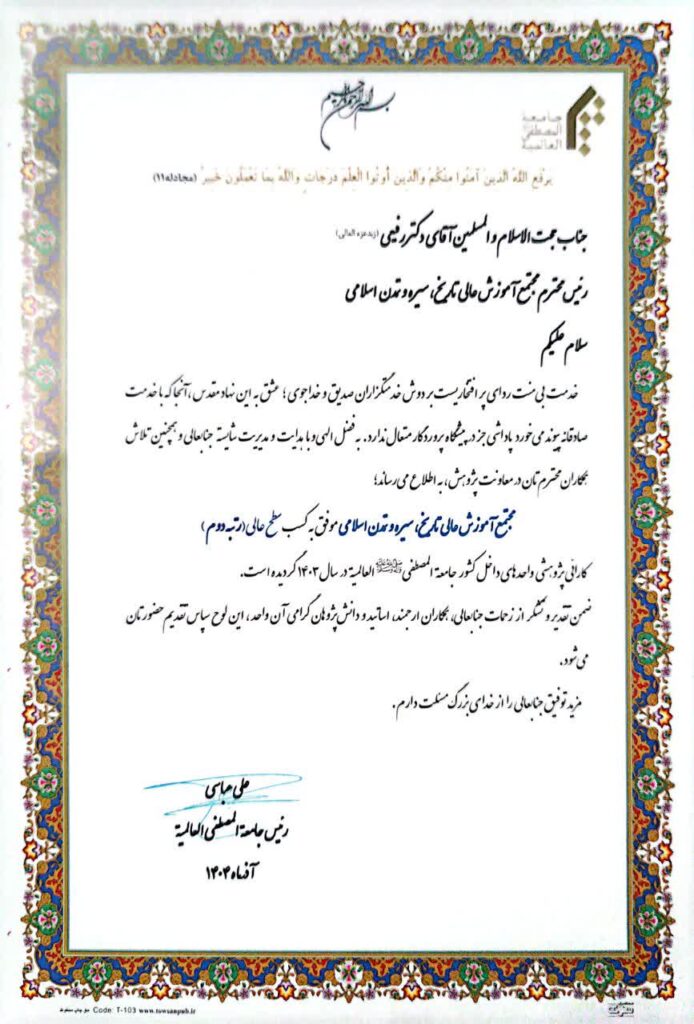 کسب سطح(A) رتبه پژوهشی مجتمع آموزش عالی تاریخ،سیره و تمدن اسلامی در سال ۱۴۰۳ در میان مراکز آموزشی المصطفی(ص) را حضور ریاست محترم مجتمع آموزش عالی تاریخ،سیره و تمدن اسلامی ،حضرت حجت الاسلام والمسلمین دکتر رفیعی، استادان،اعضاء هیئت علمی، طلاب و پژوهشگران به ویژه به معاون محترم پژوهش مجتمع حجت الاسلام والمسلمین اوصیاء و همکاران محترم معاونت پژوهش حجت الاسلام والمسلمین صادقی پناه و آقای حسینی شمس،در سایه عنایات اهل بیت علیهم السلام و فعالیت های مستمر و تلاش های مجاهدانه و دلسوزانه تبریک وتهنیت عرض می نماییم.