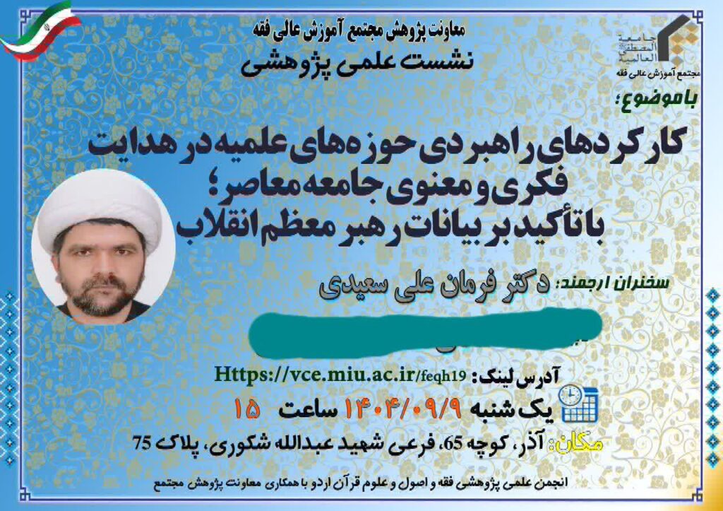 سپس دکتر فرمان سعیدی به ارائهٔ سخنرانی مفصل پیرامون موضوع نشست پرداخت. وی با استناد به بیانات رهبر معظم انقلاب، به تبیین چالشهای فکری عصر حاضر، نقش اساسی حوزههای علمیه، مسئولیتهای مراکز علمی، و ابعاد علمی و تربیتی در پرورش متخصصان دینیِ توانمند، متعهد و آگاه پرداخت. او تأکید کرد که در فضای پیچیدهٔ فکری امروز، حوزههای علمیه نه تنها مراکز هدایت علمیاند، بلکه تضمینکنندهٔ استقامت فکری، تربیت اخلاقی و بیداری معنوی جامعه نیز به شمار میروند.