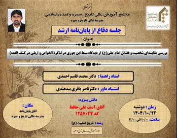 جلسه دفاع از پایان نامه ارشد دانش پژوه آصف علی حافظ با موضوع «بررسی مقایسه ای شخصیت و فضائل امام علی (علیه السلام) از دیدگاه سبط ابن جوزی در تذکرة الخواص و اربلی در کشف الغمه» با راهنمایی دکتر محمد قاسم احمدی و راهنمایی استاد ناصر باقری بیدهندی 22