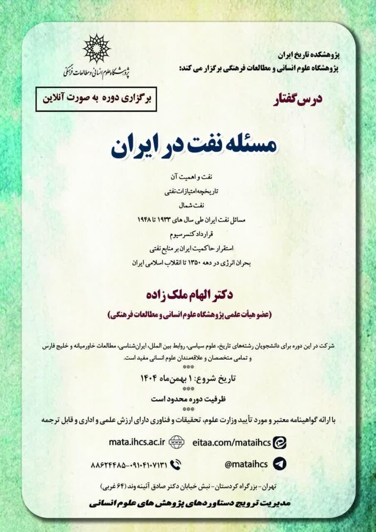 کارگاه آموزشی مجازی (برخط) مسئله نفت در ایران دکتر الهام ملکزاده تاریخ شروع: یکم بهمنماه ۱۴۰۴ پیوند ثبت نام در این دوره: https://Mata.ihcs.ac.ir/event/fa/event/792